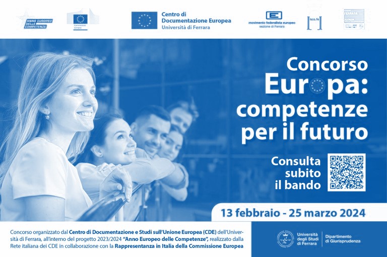 Il Centro di Documentazione e Studi sull’Unione europea (CDE) dell’Università di Ferrara bandisce, in collaborazione con il Movimento Federalista Europeo, l’Istituto di Storia Contemporanea di Ferrara e il punto locale Eurodesk del Comune di Ferrara, il Concorso “Europa: competenze per il futuro”. Il concorso fa parte del Progetto 2023/24 “Anno europeo delle competenze”, realizzato dalla Rete italiana dei CDE con la collaborazione della Rappresentanza in Italia della Commissione europea.