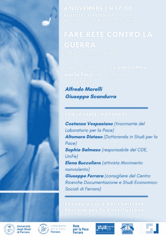 Il 4 Novembre 2024, alle ore 17, presso la biblioteca Ariostea (Via delle scienze 17, Ferrara) si terrà l’evento evento dedicato ai due anni di attività del Laboratorio per la Pace dell’Università di Ferrara e la presentazione del nuovo libro a cura di Alfredo Mario Morelli.