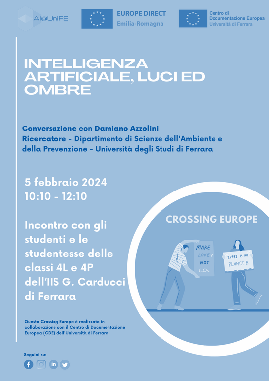 Incontro di Crossing Europe tra gli studenti dell’IIS G. Carducci di Ferrara e Damiano Azzolini, Ricercatore del Dipartimento di Scienze dell’Ambiente e della Prevenzione di Unife. L’incontro è realizzato dallo Europe Direct della Regione Emilia-Romagna in collaborazione con il Centro di Documentazione e studi sull’Unione europea dell’Università di Ferrara.